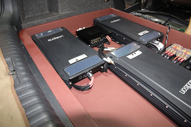 一开始的功放则是选择了意大利欧迪臣,共2台。且与喜力士10路DSP都安装于后尾箱底部,低音置于后尾箱。