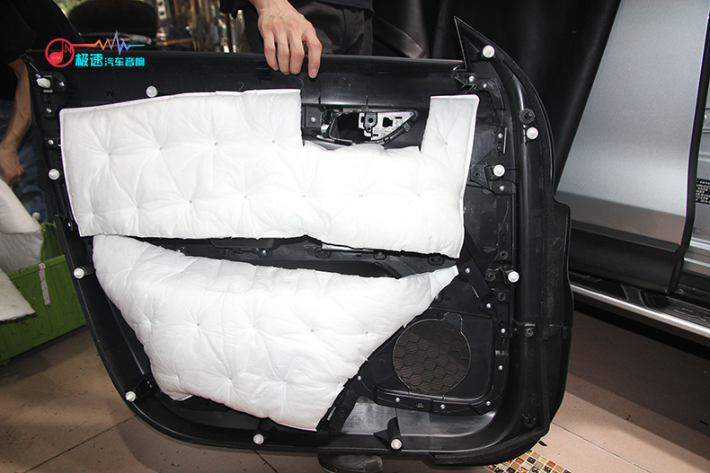 开始四门隔音施工,师傅根据马自达CX-5的车况做了条形隔音,马自达CX-5原车的隔音相对其他一层薄膜的好很多。
