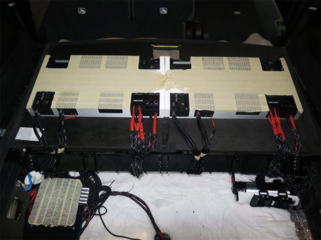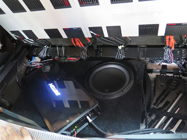 本次升级依然延续店内经典,一套摩雷38周年纪念版603在前声场打头阵,配合着一套摩雷38周年纪念版602两分频进行配合,并用一只捷力10W3V3低音喇叭进行补充,在某些程度上来说,丰富的扬声器就能带来的是非一般的音质效果。但一套完美的套装又怎能少得了好的音源和功放的加入呢?两台意大利MOSCONI ZERO.4功放和一台德国ETON ECC600.2功放的加入,更有喜力士10路DSP处理器优化的音频信号,可以说,每一件器材都是发烧级的利器。车主的音乐品味让人艳羡。