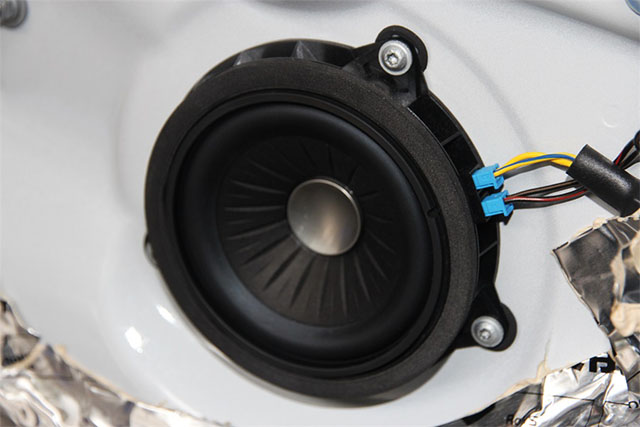 当然,喇叭多是安装在门板上的。虽然宝马车系的门板相对其他车系来说有明显的优势,但是隔音效果有所欠缺,无法提供最佳的发声环境,尤其是拆开门板后展露出来的金属钣金以及门板上的不规则空洞,这些因素影响了喇叭的失真。门板进行三层隔音处理,内外双层用止振材料进行止振处理,门板内饰用吸音棉进行隔音处理,增强门板的虑音效果。