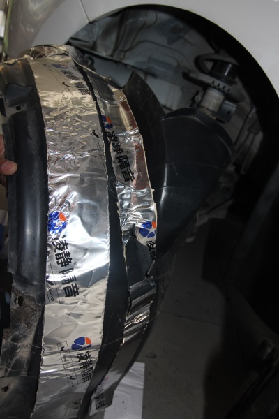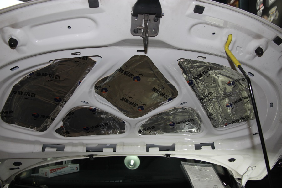 贴装引擎盖隔音,将隔音材料裁剪成小块贴装在引擎盖的内凹部分,可以有效的降低发动机噪音的传递,而且能够有效的降低发动机高温对于引擎盖位置的直接烘烤,延缓引擎盖位置的车漆老化龟裂现象。翼子板也进行了相应的止振处理,胎噪很大一部分就是从轮胎这里产生并传入驾驶舱。想完全隔绝胎噪是不可能滴。我们能做的也就是将部分噪音消减衰弱。