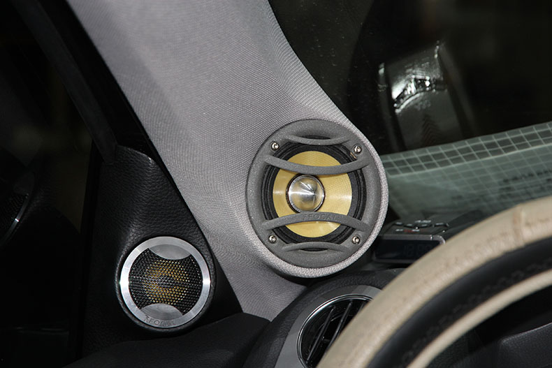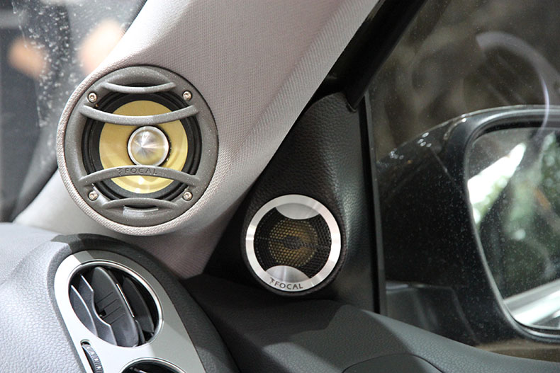 前声场喇叭是法国劲浪KRX3,分别将高音,中音,中低音安装于:三角位、A柱、前门板原喇叭处;其中中音采用了倒模工艺。喇叭的安装朝向也决定了音质的效果。