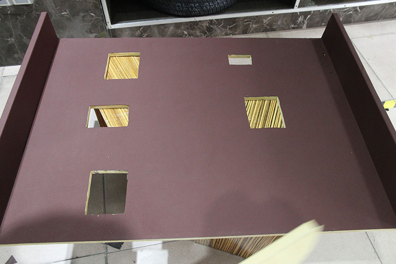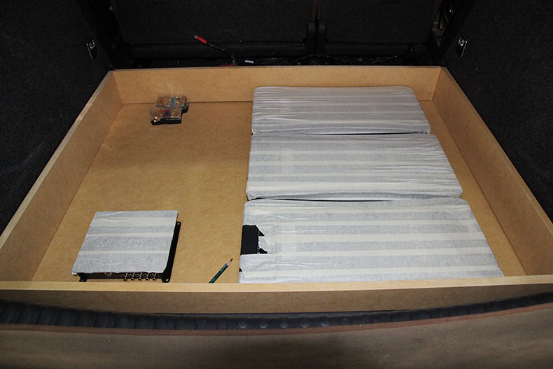 尾箱木板初步完成,准备为摆放设计,达到最美观;摆放前用美纹纸对功放和DSP进行保护