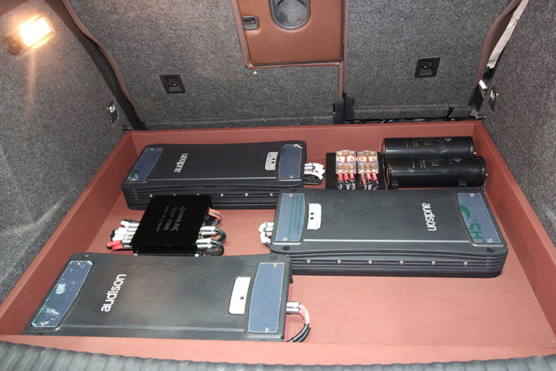 一开始的功放则是选择了意大利欧迪臣,共2台。且与喜力士10路DSP都安装于后尾箱底部,低音置于后尾箱。