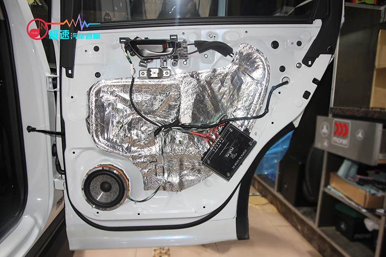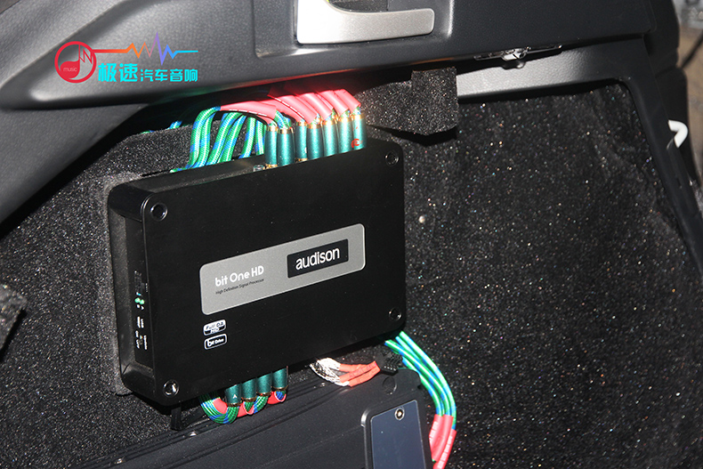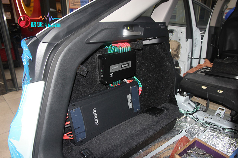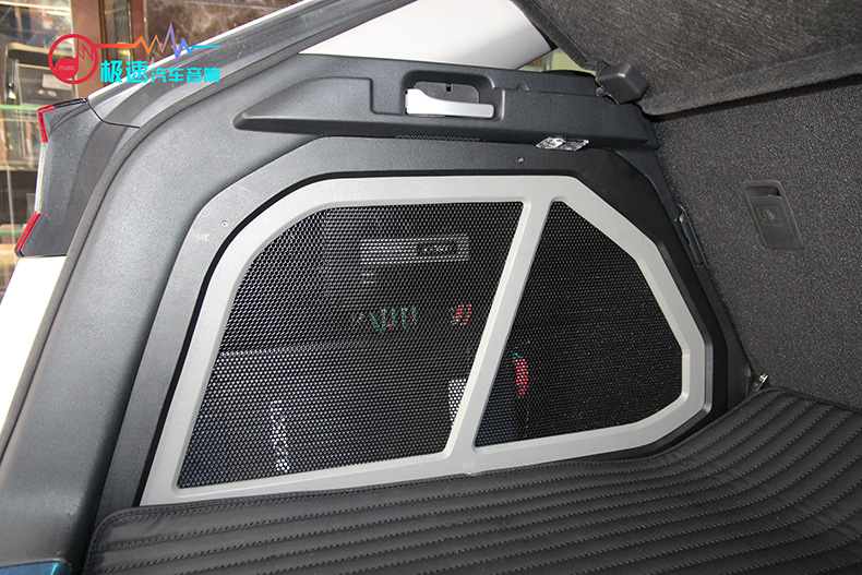 三台一线进口品牌功放则安装在尾箱处,本着最小的空间设计出最大的效果,保证了声场喇叭的功率输出稳定。三台功放和DSP的设计安装,就像魔术师变魔术一样,还原后却看不出一点改装的痕迹。