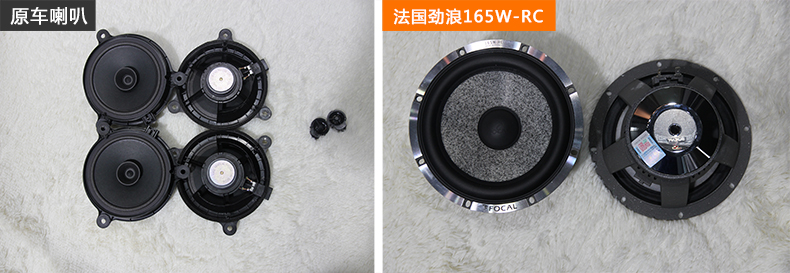 前声场喇叭选择了法国劲浪最高系列最高二分频进口165W-RC套装喇叭,此套喇叭让你体会到“极致原音”。发烧级的165W-RC中低音喇叭安装在原车喇叭位