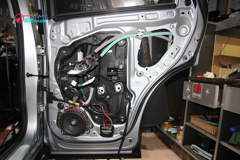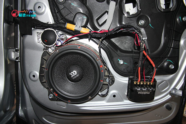 车主自带后声场摩雷玛仕舞套装喇叭,师傅将其安装在后门中低音喇叭位上,而原车没有后声场高音位,师傅则把高音喇叭安装在中低音喇叭旁边
