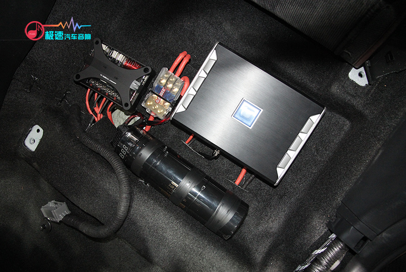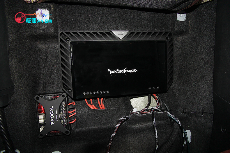 两台功放分别是美国来福T600.4四路功放和阿尔派PDR-M65单路功放,四路功放推四门的喇叭,单路功放推低音炮,低频力度更大,效果更佳。两台功放分别安装在座椅底