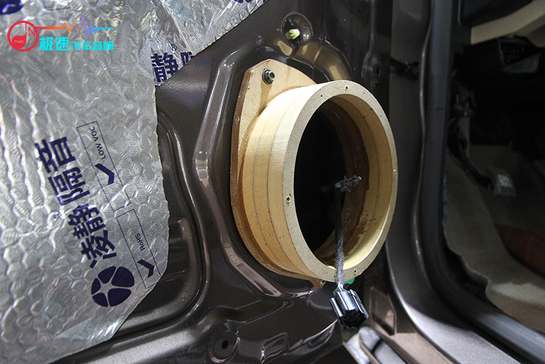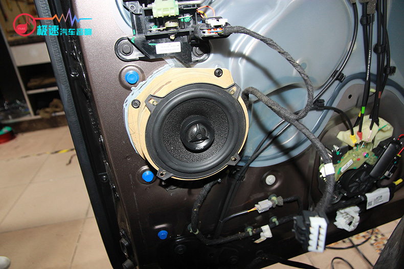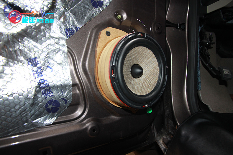 然后开始安装进口喇叭——法国劲浪PS 165FX两分频套装,喇叭无损安装在原车位。中低音喇叭安装在原车门板上