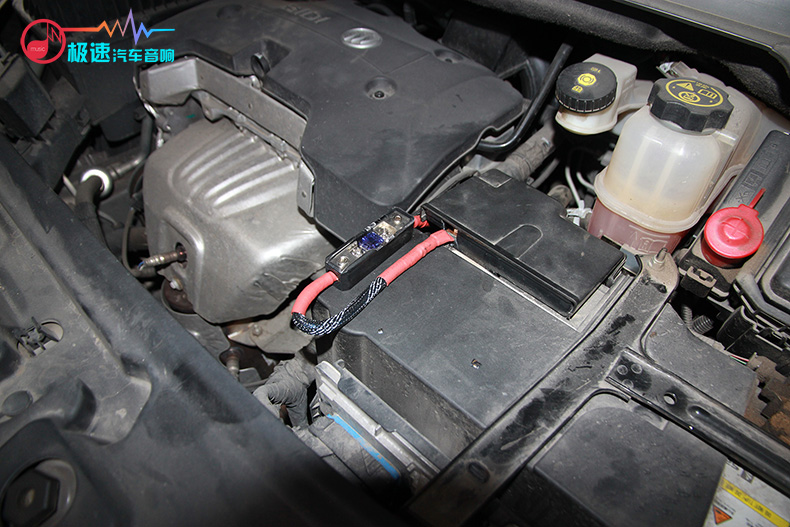 音响改装安全第一,保险盒保护还是少不了的,将其安装在原车电池旁边